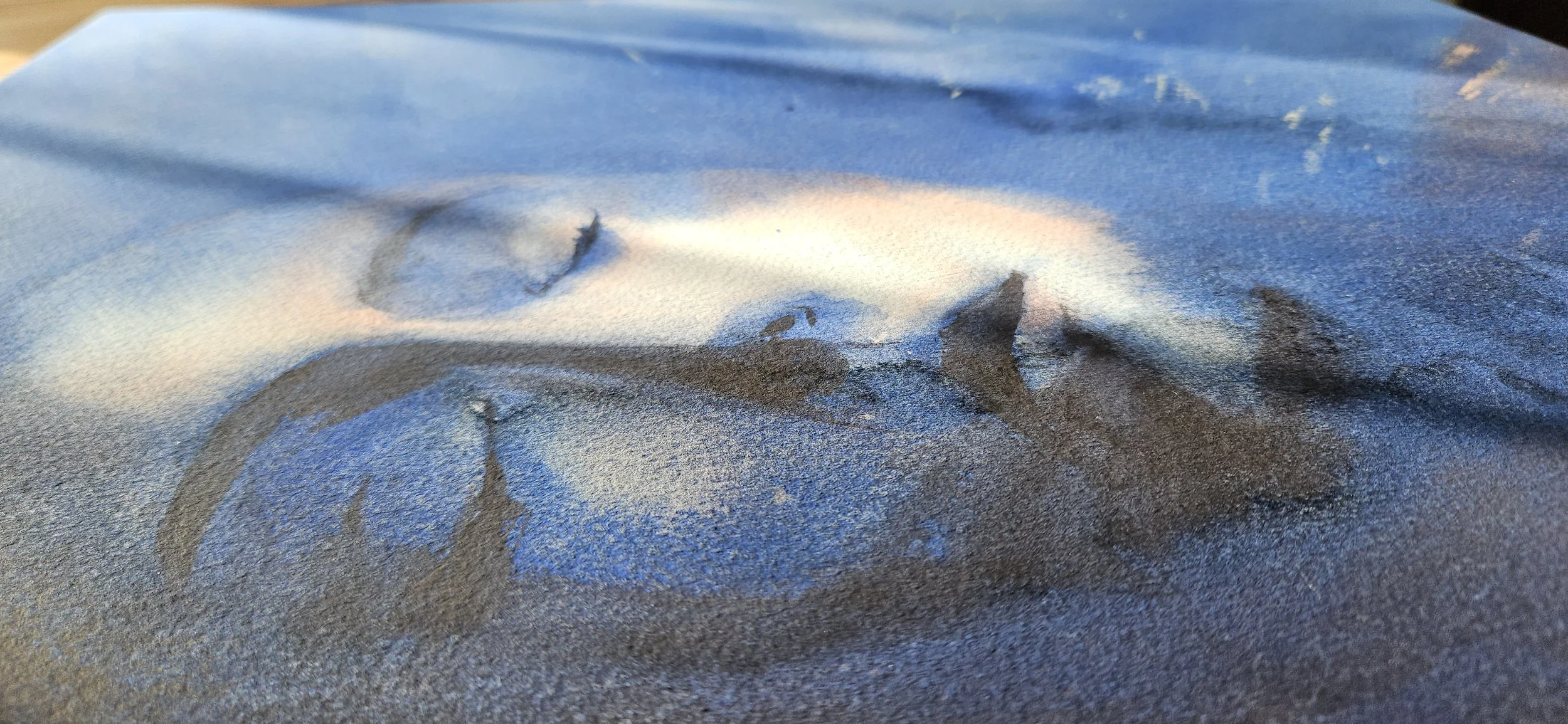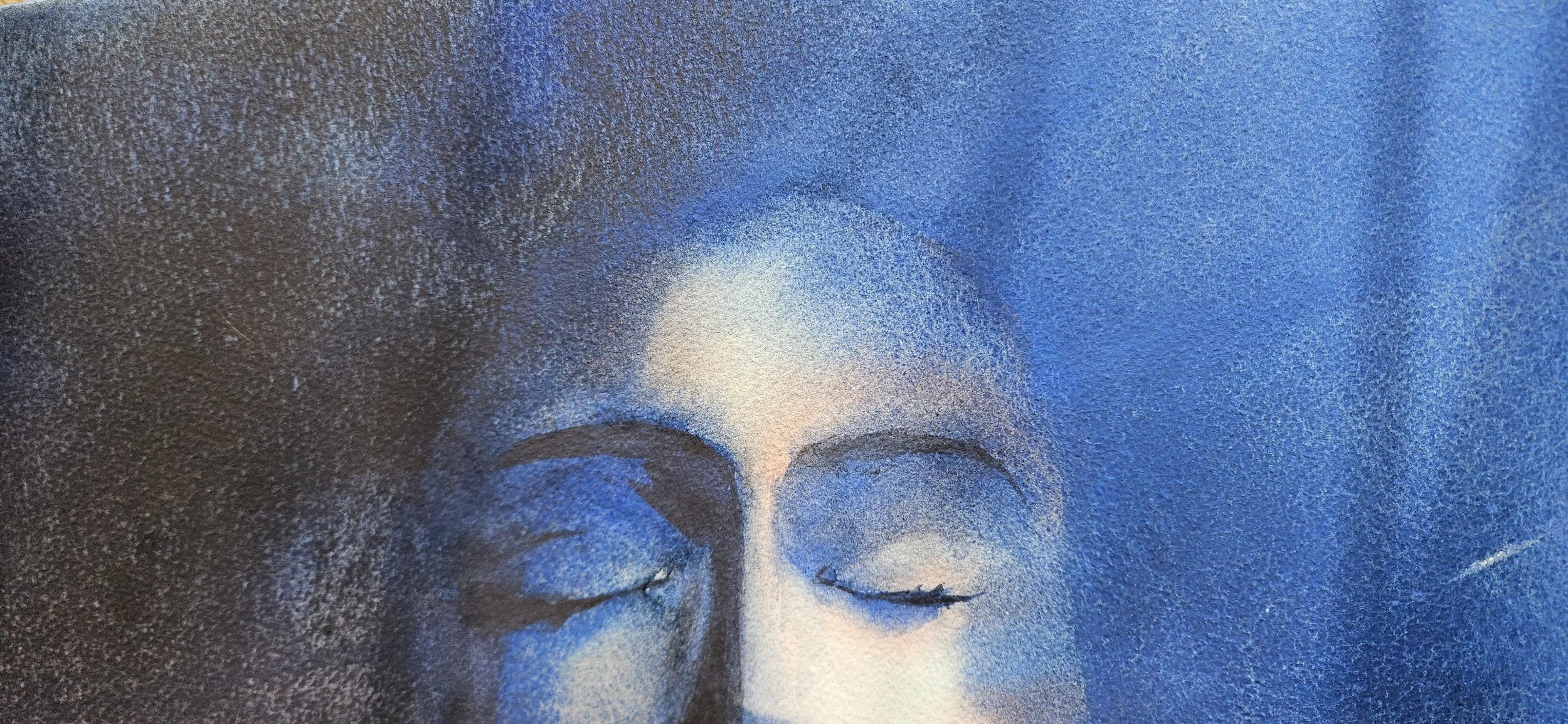 In der dunkelblauen Strömung des Kunstwerks liegt ein Gesicht, versunken in vollkommener Ruhe.